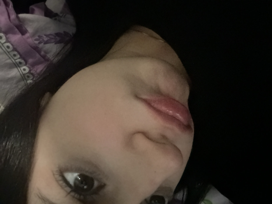 The image displays a close-up, angled view of a female individual's face, occupying the majority of the frame. The subject presents with light to medium skin tone, dark hair, and dark brown eyes with visible eyelashes, looking directly into the camera. Her nose is partially visible, and her full lips appear reddish-pink and slightly glossy. She is wearing a dark-colored garment, consistent with a black shirt or top, and a thin, light-colored chain necklace is visible around her neck. The background features a soft, purple-colored fabric with repeating white or light-colored horizontal patterns and a stylized leaf motif, indicative of bedding or a pillow. The scene is indoors, consistent with a residential setting. The specific location within the city of Unknown, Unknown cannot be determined from the provided visual information.