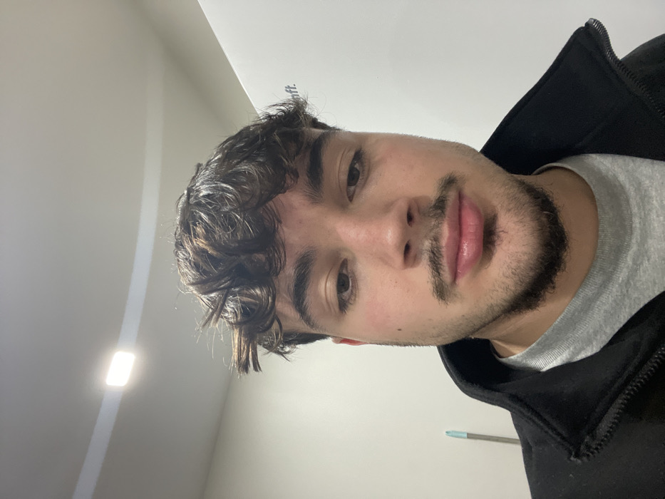 A young man poses for a selfie. He has curly, dark brown hair and a trimmed beard. He gazes directly at the camera. He wears a gray shirt under a black zip-up jacket. The background appears to be a white wall illuminated by an overhead light. The image is rotated slightly counter-clockwise.