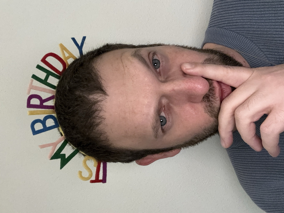 The image displays an adult male, captured from the chest up, against a plain, light-colored wall. The setting is identified as Erba, Italy. The subject has short, dark brown hair and a beard. He wears a multi-colored headband adorned with felt letters spelling "IT'S MY BIRTHDAY" across the top of his head. His eyes are blue, and he maintains direct eye contact with the camera, exhibiting a neutral to slightly stern expression. The subject's right index finger is positioned vertically, pressed against his upper lip and nose, partially obscuring his mouth. He is wearing a light blue, ribbed long-sleeved garment.