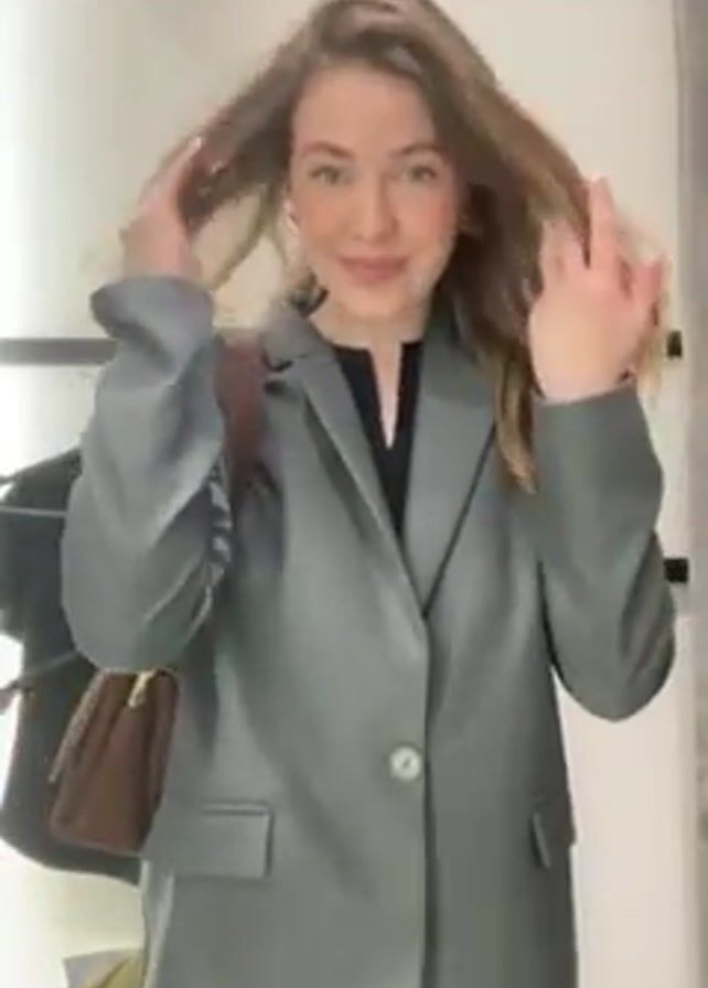 A young woman with long blonde hair poses for the camera in a dressing room. She is wearing a gray blazer over a black shirt, and a brown suede purse hangs from her shoulder. She smiles and runs her fingers through her hair. There are other clothing items visible in the background, hanging on a rack.