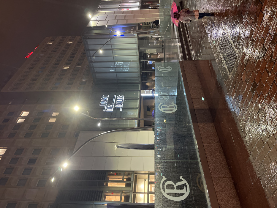 A rainy night view features modern architecture, including a building labeled "PLACE DES HALLES" with a distinctive "R" logo on a water feature
