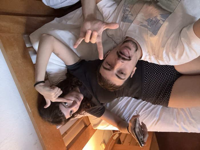 Two individuals are lying in a bed covered with white sheets. A woman with dark curly hair and bangs makes a finger frame gesture around her eye. A man, slightly behind her, sticks out his tongue and makes a rock-on gesture with his hand. He's wearing a white t-shirt, while the woman is in a black one. The man holds a cell phone, suggesting they are taking a selfie. They are in what appears to be a wooden bed frame. The lighting suggests an indoor setting, possibly a bedroom.