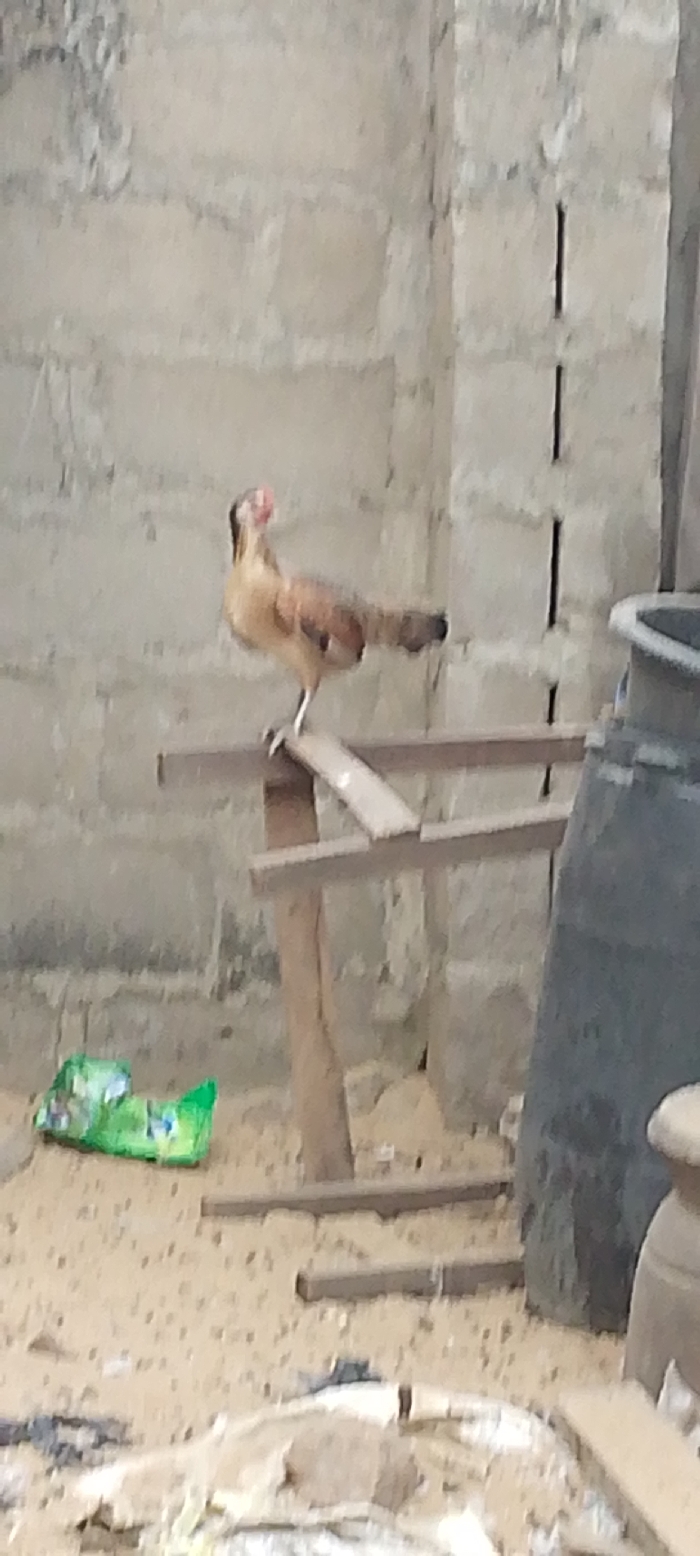 A light brown chicken stands on a makeshift wooden structure in a cluttered, somewhat dirty environment