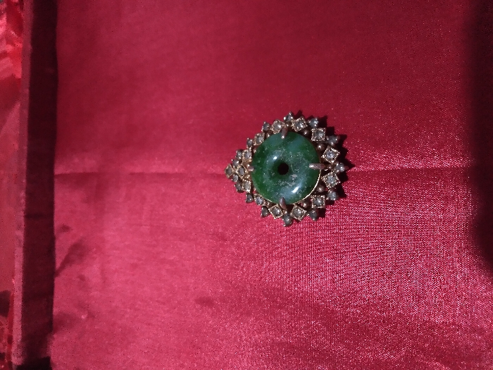 A single, ornate piece of jewelry is depicted resting on a deep red, subtly reflective fabric surface. The central element of the jewelry is a dark green, circular, flat stone with a distinct central perforation. This stone is encased in a metallic frame, which appears gold or bronze in tone, featuring a detailed perimeter composed of approximately 20 smaller, clear, faceted stones, each set in a square or diamond-shaped bezel, interspersed with small metallic spheres or studs. The overall form of the jewelry is roughly circular with an ornate, scalloped edge. The fabric background exhibits slight creasing and a subtle sheen. No individuals, actions, or interactions are present in the scene. The image originates from Ciherang, Indonesia.
