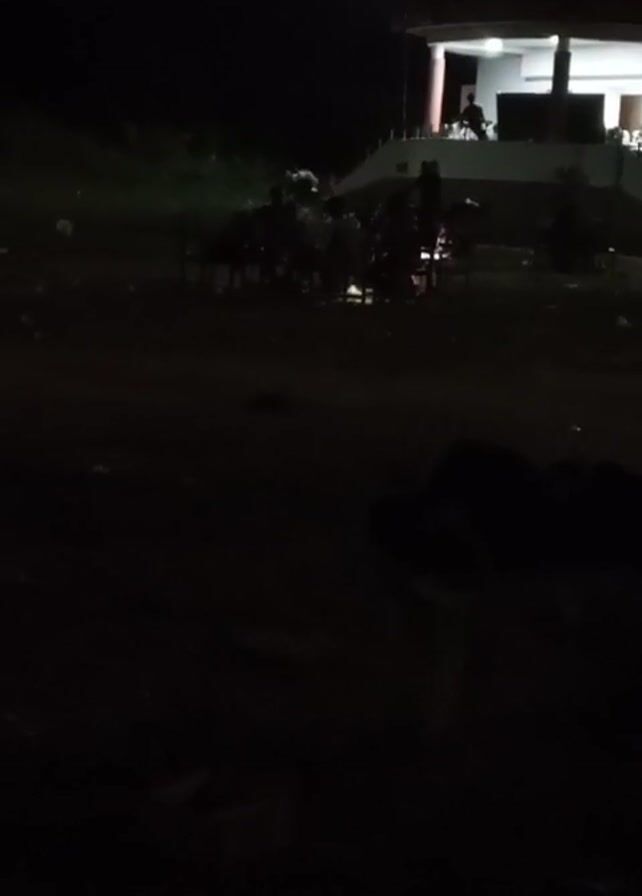 At night, a group of people sits around a campfire, its light barely illuminating their figures. Above them, a building stands on a slight elevation, a few individuals visible on its porch, under the glow of a single light. The surrounding area appears to be an open space with dark ground and minimal visible features. The camera is static, capturing the scene from a distance, emphasizing the contrast between the darkness and the scattered light sources.