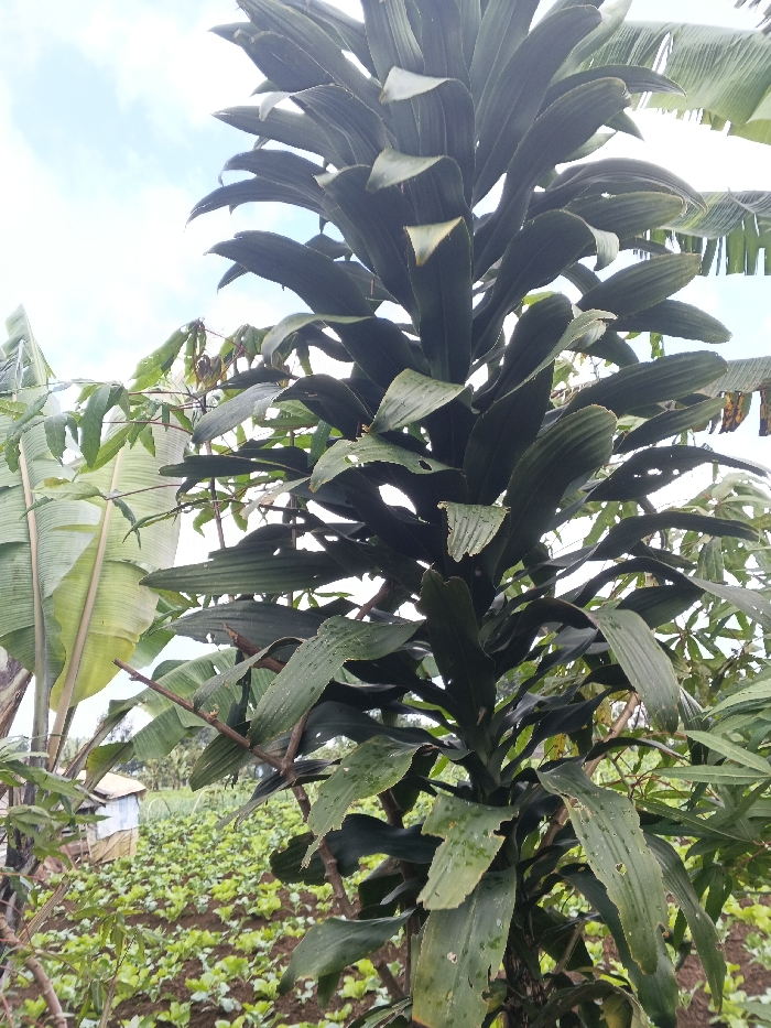 The image displays an outdoor scene in the city of Unknown, Uruguay, focusing on dense vegetation. A tall, dark green plant with elongated, broad leaves, some exhibiting minor perforations and fraying, dominates the central and right foreground. To the left, partially obscured, are large, lighter green leaves resembling banana plant foliage, alongside other sparse green branches. In the midground, a cultivated plot of dark soil contains numerous small, light green leafy plants, arranged in discernible rows. A small, simple structure with a light-colored, possibly corrugated metal roof and walls is partially visible on the left side of the midground, behind some foliage. The upper portion of the frame reveals a partly cloudy sky with patches of light blue and scattered white clouds. No individuals or active interactions are present in the static scene.