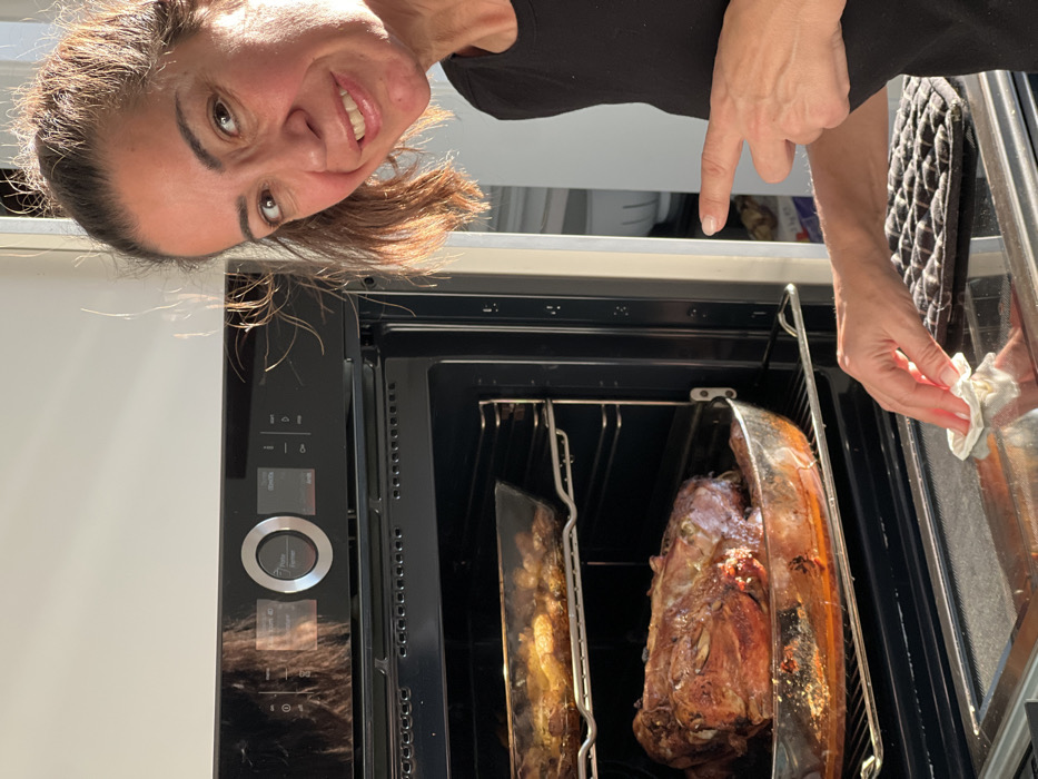 The scene depicts a kitchen interior in Junglinster, Luxembourg. An adult female, with dark hair pulled back and a black short-sleeved top, is positioned to the right of a large, black built-in oven. She is smiling and looking directly at the viewer. Her right hand, holding a small white cloth, is wiping the bottom edge of the oven door, which is partially open. Her left hand is raised, with the index finger extended and pointing towards the right, out of the frame. The oven features a digital control panel with a central circular knob and displays text including "Cuis. 4D" and "Prêt à Fermer" (Ready to Close), suggesting a Bosch appliance. Inside the open oven, two glass baking dishes are visible on separate racks. The lower dish contains a large, roasted piece of meat, likely a leg of lamb or similar, resting in a reddish liquid. The upper dish holds smaller, lighter-colored food items, possibly potatoes or roasted vegetables. A dark, quilted potholder or trivet is placed on the countertop surface to the right of the oven door, beneath the woman's right arm. The background consists of a plain white wall or cabinet, with bright lighting illuminating the scene.