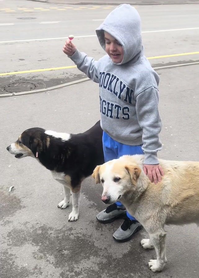 A young boy is standing on a sidewalk with two dogs. The boy is wearing a gray hooded sweatshirt with "Brooklyn Nights" written on it, blue pants, and gray sneakers. The hood is up. He is smiling and giving a thumbs-up with his left hand. His right hand is resting on the back of a light brown dog standing to his right. The dog is looking down and to the left. Another dog, black with white markings, is standing to the left of the boy. The dogs have ear tags. The background includes a street, buildings, and cars. The sidewalk is cracked and has some debris on it. The weather appears overcast.