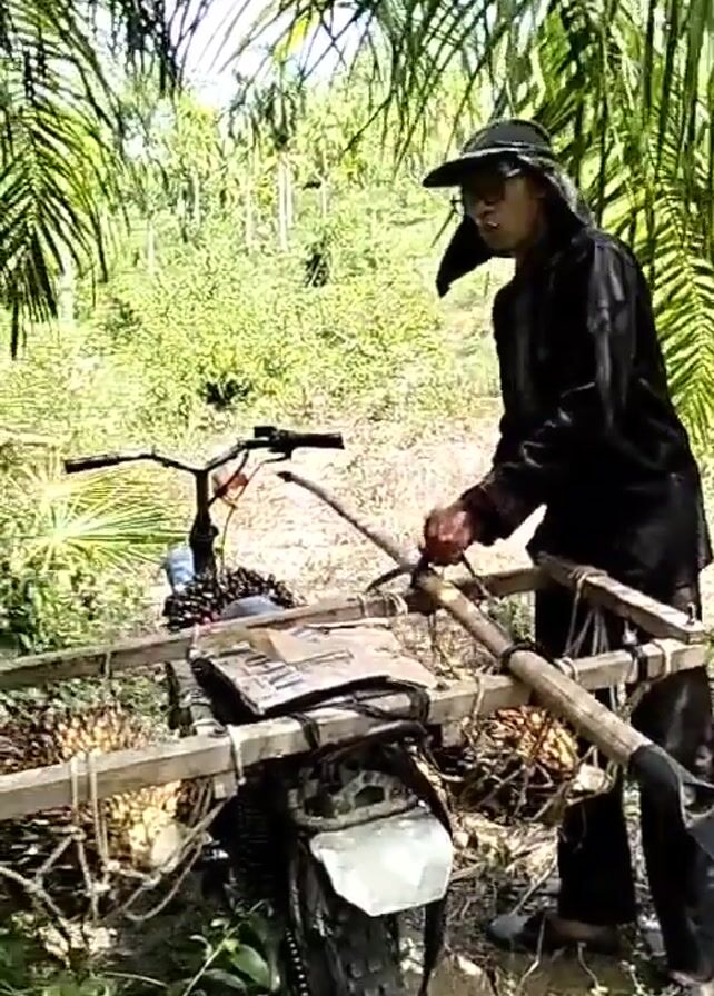 person with a hat and sunglasses, dressed in black, standing next to a modified motorcycle in what appears to be a palm plantation. The motorcycle has a makeshift cart attached, loaded with what seem to be palm fruits and farming tools, including a hoe. The individual is adjusting something on the cart. The camera then pans to show a palm tree with clusters of palm fruits growing. The video ends with the person back on the motorcycle, apparently getting ready to move through the plantation. The scene is sunny, the plantation is dense with vegetation.