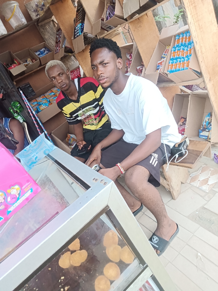 This image depicts a market stall or small shop located in Orie Uratta, Nigeria. Two males are seated, looking directly at the camera. In the foreground, to the right, a male subject with dark, short hair and a short beard wears a white crew-neck t-shirt, black athletic shorts with an Adidas logo, and black slide sandals featuring a Louis Vuitton logo. A red and white beaded bracelet is on his left wrist. He is seated on a low wooden structure, holding a metallic object in his right hand. A white charging cable extends from a black device on the wooden surface beside him. Behind and to the left of the first subject, a second male subject with bleached blonde hair wears a striped short-sleeved shirt in yellow, black, and red, and dark shorts. He is also seated on a low wooden structure, with his hands resting in his lap, looking towards the camera. A partial view of a third individual's arm and shoulder, wearing a blue and white patterned garment, is visible in the far left. The background features shelves constructed from numerous open, repurposed cardboard boxes, filled with various packaged consumer goods, including stacks of "Sam Krackers" in blue and orange packaging. A white plastic bucket is visible in the upper left. In the immediate foreground, a rectangular glass display case contains multiple round, light-brown fried food items. A pink plastic item, possibly a bag or container, rests on top of the display case. The floor is tiled with light-colored tiles in a geometric pattern.