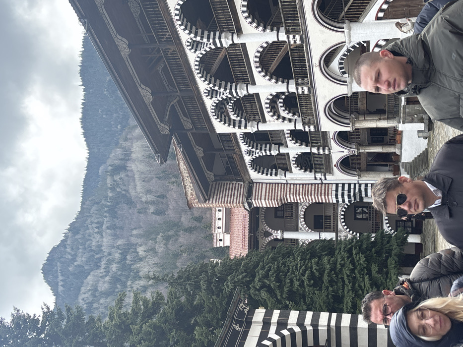 An outdoor scene captured at Rila Monastery, located in the Rila Mountains of Bulgaria, under an overcast grey sky