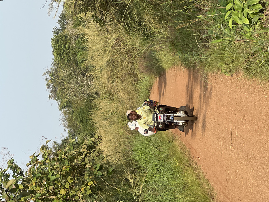 On an unpaved, reddish-brown dirt track in Wuinta, Ghana, a black utility motorcycle, featuring chrome accents, travels towards the viewer. The track is bordered on both sides by dense vegetation, including tall green and light brown grasses, shrubs, and trees, beneath a clear light blue sky. A male operator is driving the motorcycle. He wears a yellow and green patterned short-sleeved shirt, dark trousers, and dark footwear. His hands are on the handlebars, and his gaze is directed forward. Behind the driver are two passengers. The first passenger, seated directly behind the driver, is wearing dark clothing and carries a large white bundle or bag over their left shoulder. The second passenger is seated furthest back, with only their head and upper torso partially visible due to the first passenger. All three individuals are upright on the moving motorcycle.