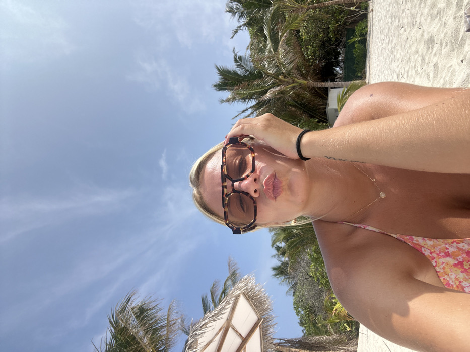 A blonde woman in a floral bikini poses for a selfie on a sunny beach
