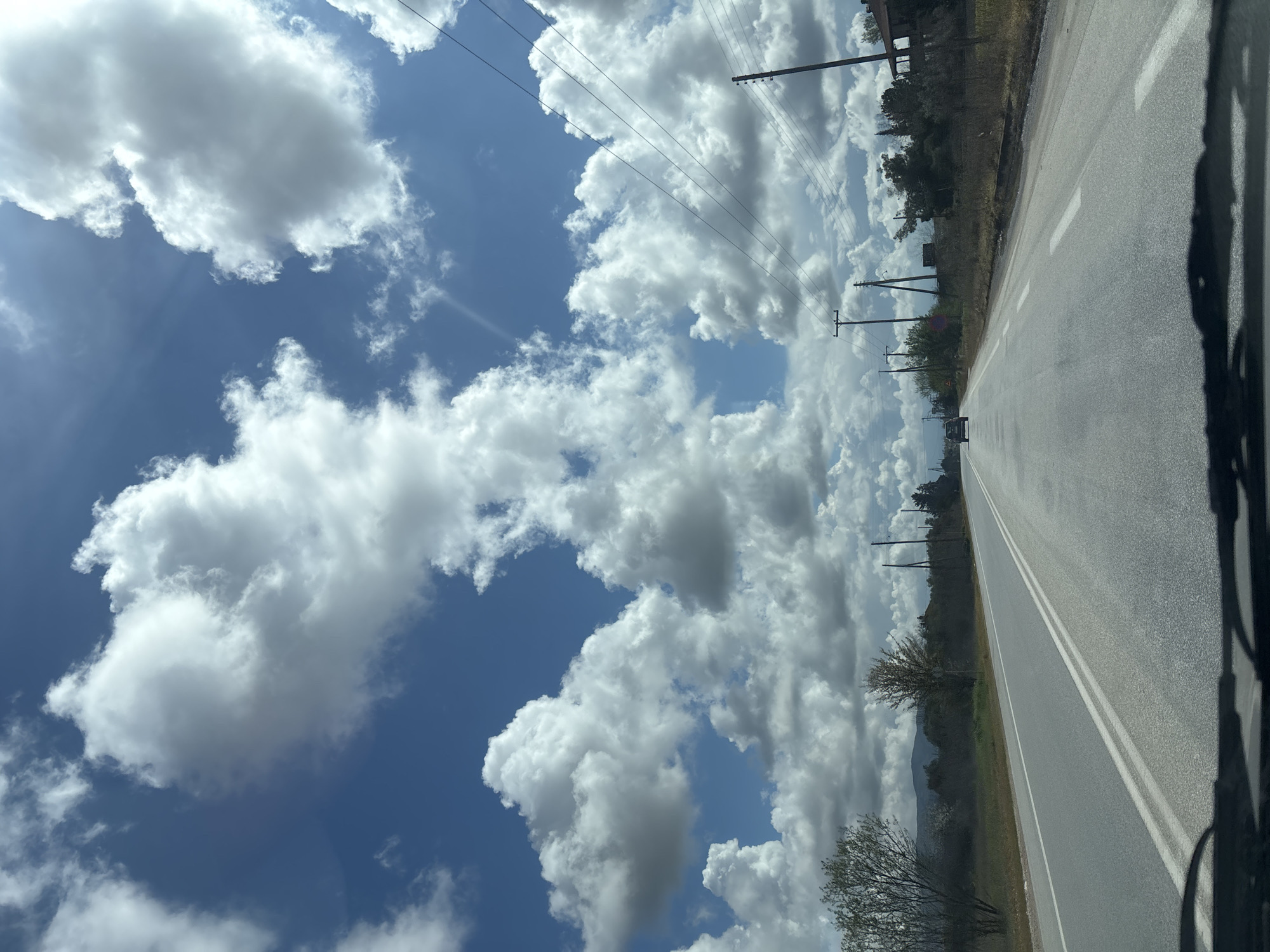 The image presents a forward-facing view from inside a vehicle on a paved two-lane road within the Prosotsani Municipal Unit, Greece. The road features a double solid white line separating the lanes and solid white lines marking the shoulders, extending towards the horizon. A dark-colored passenger car is visible in the distance, traveling in the same direction in the right lane. The foreground includes the upper portion of a vehicle's dashboard and windshield wipers. The sky above is bright blue, partially covered by numerous large, white cumulus clouds, with visible sun glare in the upper right. To the left of the road, sparse trees and dry vegetation are present, with distant hills visible on the horizon. The right side of the road features multiple wooden utility poles with overhead lines, dry ground cover, and a partially obscured red circular sign. A building with a reddish roof structure is partially visible further along the right side of the road. No individuals are depicted.