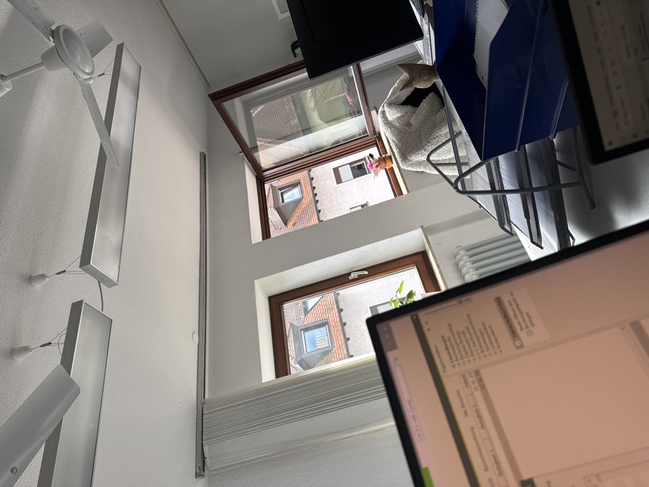 The image displays an interior room of a building located in Rastatt, Germany, viewed from an occupant's perspective. The room features white painted walls and a textured white ceiling. Three rectangular, silver-colored LED panel lights are suspended from the ceiling by wires, with a white three-bladed ceiling fan also present on the right side. Three distinct windows with dark brown wooden frames line the far wall. The leftmost window is partially covered by a white vertical blind, and a white, ribbed radiator is installed beneath it. The middle window displays a small green potted plant on its sill. The rightmost window is open, tilted inwards at the top, with a pink flowering plant in a pot resting on its sill. Beyond the windows, an urban exterior is visible, composed of buildings with light-colored facades and reddish-brown tiled roofs featuring multiple dormer windows. In the immediate foreground on the left, a computer monitor displays what appears to be an email client or file management system with German text. To the right, a second, black computer monitor is partially visible. On the desk, a three-tiered black mesh letter tray filled with papers is positioned next to a blue plastic letter tray also containing papers. A dark office chair, draped with a light-colored textured blanket or garment, is located near the rightmost window. A light-colored, possibly wooden, owl-shaped decorative object is also on the desk. No individuals are visible in the scene.