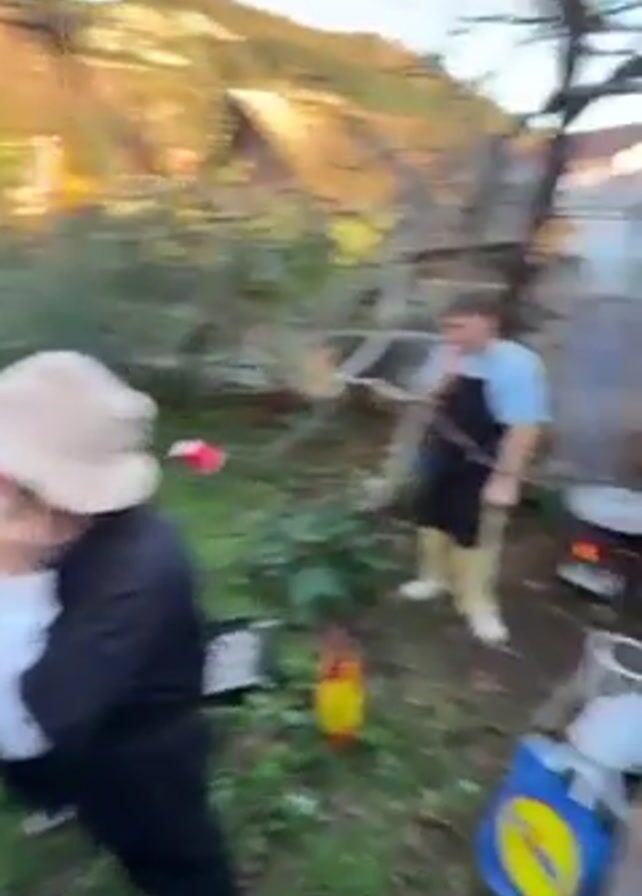 group of people gathered outdoors. Initially, five people are visible, with a man in a red beanie gesturing while speaking. The camera pans to reveal a table laden with food and red cups, surrounded by people sitting and standing. Then the camera focuses on a man wearing a green and white sweater and sunglasses who expresses gratitude, smiling directly at the camera. The video ends with a close-up of the man's face, highlighting his sunglasses and mustache. The setting appears to be a backyard or garden with trees and buildings in the background.