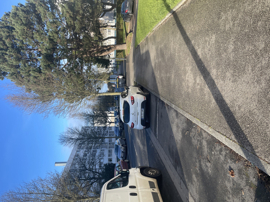 The image depicts a static, forensic view of a residential street, **Rue de Bernières in Caen, France**, on a clear, sunny day. The perspective is from the roadside, looking south-southeast down the thoroughfare. The scene is dominated by a paved asphalt road in the center, flanked by a parking strip and a concrete sidewalk on the right, and a parallel parking lane on the left. On the immediate left foreground, the front quarter of a dirty white panel van is visible, parked on the street. Directly adjacent to the sidewalk, a white Renault Clio V hatchback, license plate "EV-721-WH," is parked head-in within a marked parking space. The vehicle is clean. Behind the Clio, another empty marked parking space is visible. A wide, light grey concrete sidewalk runs parallel to the road on the right side of the frame, bordered by a neatly mown strip of green grass. Long, dark shadows, indicative of direct sunlight, stretch diagonally across the sidewalk and foreground from an unseen source to the left. The street extends into the distance, lined by multi-story residential apartment buildings. On the left, several eight to ten-story buildings with white facades and numerous windows are visible, with a prominent tall, rectangular chimney structure rising from the roofline of the nearest building. Various other passenger vehicles are parked along the street on both sides, including a red hatchback and a silver hatchback visible on the left. The environment features a mix of bare deciduous trees with thin branches and large, mature evergreen pine trees, particularly on the right side of the image, where a dense pine tree stands prominently. Utility poles are present along the street. A grey municipal waste bin on wheels is visible further down the street on the right. The sky is clear and bright blue, with no clouds. No people are present in the scene, and no actions or interactions are depicted.