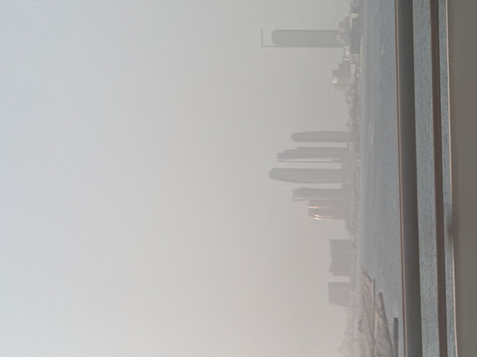 The image displays a distant cityscape observed across a body of water, originating from Al Hidayriyyat, United Arab Emirates. In the foreground, two horizontal, light-colored rails or barriers traverse the bottom portion of the frame. Above these, a grey-blue expanse of water with minimal surface texture is visible. The midground and background are dominated by a sprawling urban skyline, heavily diffused by a pervasive, light grey atmospheric haze that obscures fine detail. The skyline includes a prominent cluster of several tall, slender skyscrapers, one of which exhibits a reflective, possibly metallic-hued facade. Further to the right, another distinct, very tall, rectangular building with an open-frame design at its top is discernible. The overall environment is characterized by substantial atmospheric turbidity, suggesting conditions such as fog, mist, or dust. No individuals, specific actions, or interactions are present in the scene.