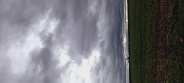 The image depicts an agricultural landscape within the city of Ait Naamane, Morocco, under a heavily overcast sky. The upper two-thirds of the frame are filled with dense, dark grey and white stratocumulus clouds. The lower third of the frame shows a flat, open terrain. The immediate foreground consists of disturbed brown earth with sparse, dry vegetation. Adjacent to this, a broad expanse of vibrant green cultivated field extends towards the horizon. A dark, continuous line of distant trees or dense foliage forms the extreme horizon line beneath the clouds. No human subjects, animals, objects, or structures are visible within the frame. The ambient light is diffused, indicative of an overcast day.