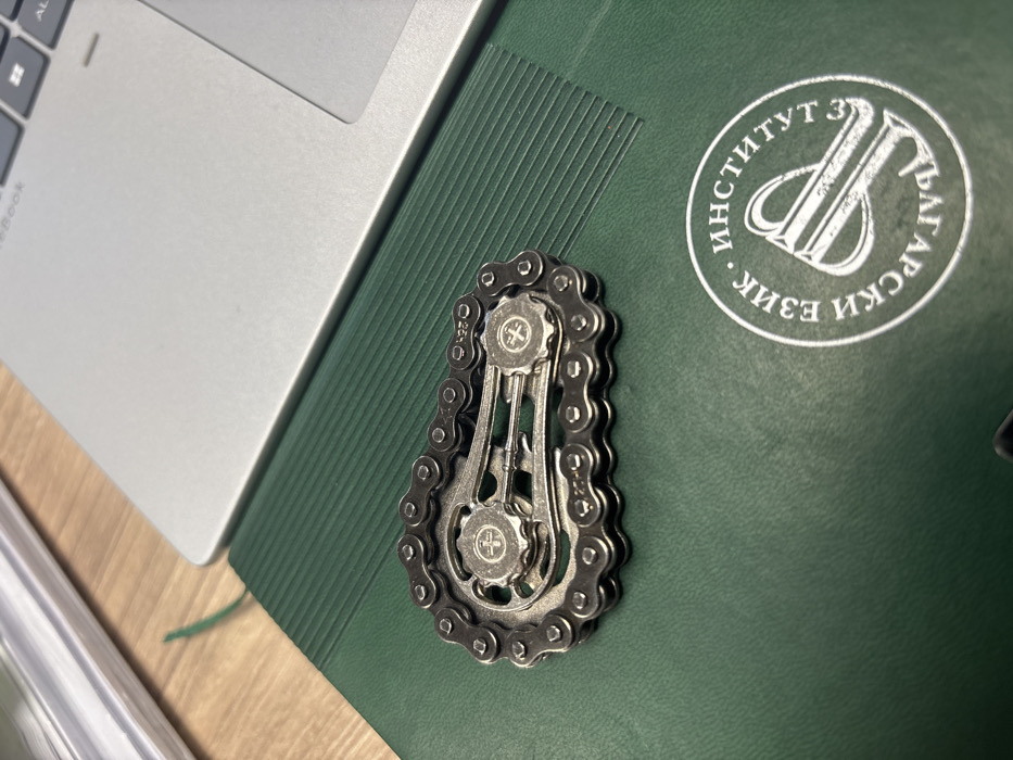 The scene is an indoor tabletop environment, located in Ruptsi, Bulgaria. A dark grey metallic fidget toy, shaped like an elongated rectangle formed from a bicycle chain with two integrated gears and connecting rods, rests prominently on a dark green, textured notebook. The notebook's bottom right corner displays a partially visible white circular logo featuring Cyrillic text: "БЪЛГАРСКИ ЕЗИК • ИНСТИТУТ •" (Bulgarian Language • Institute •) and a stylized character resembling a capital 'P'. A green fabric bookmark is partially visible emerging from the top edge of the notebook. To the right and behind the notebook, a silver-colored laptop is open, with its keyboard and trackpad area visible. All objects are positioned on a light brown wooden desk surface. No individuals are present. The objects are stationary.