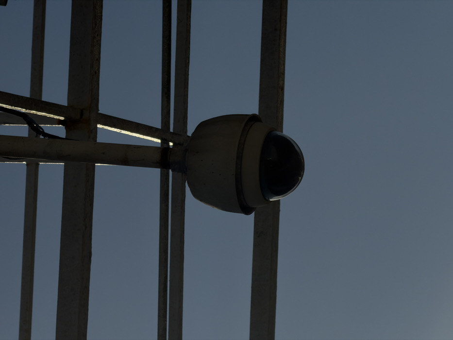 - "A surveillance camera, encased in a rounded white housing with a dark dome lens, is affixed to a weathered, white metal structure" by FM-z2WOI2, licensed under CC BY 4.0