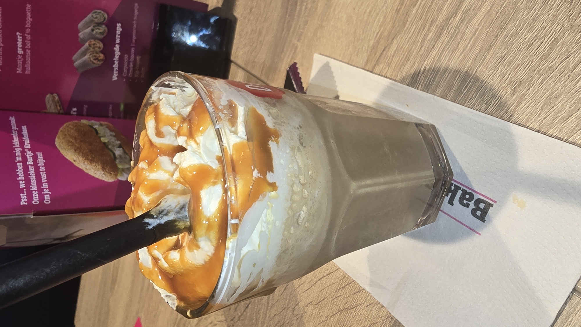 The image depicts a cold beverage on a light wood-grain table within an establishment, likely a cafe or restaurant, in Helmond, Netherlands. The central subject is a clear, polygonal glass containing a layered drink. The bottom layer consists of a light brown liquid with some aeration, topped by a substantial layer of white whipped cream. A thick, golden-brown caramel sauce is generously drizzled over the whipped cream. A black plastic straw is inserted vertically into the drink, piercing the whipped cream and caramel. The glass rests on a white paper napkin, partially obscuring the word "Bak..." printed in black with a pink underline. A small, faint yellowish stain is present on the napkin below the glass. In the background, two upright magenta-colored menu boards with white Dutch text are visible. The left board advertises a "klassieker Bartje" with "Kruidenmayo" and displays an image of a breaded, elongated sandwich or snack. The right board lists options such as "Mooie groter?", "Italiaanse bol of ½ baguette", and "Versbelegde wraps" with ingredients like "Carpaccio" and "Kip-haas". Below the right menu board, a dark, reflective surface shows indistinct light reflections. No individuals are visible in the scene.