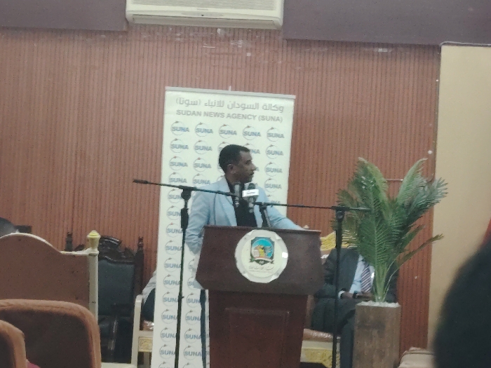 A dark-complexioned man with short dark hair, wearing a light blue blazer over a dark shirt, stands behind a dark wooden lectern. He is looking towards his right, with two microphones positioned on the lectern facing him. The lectern bears a circular emblem on its front. Behind the man is a white banner displaying "SUDAN NEWS AGENCY (SUNA)" in English and Arabic, with multiple circular "SUNA" logos below. The wall behind the banner is clad in reddish-brown vertical wooden paneling. An air conditioning unit is mounted high on the wall. To the right of the lectern, a tall potted plant with green fronds stands in a rectangular brown planter, partially obscuring a seated individual in a dark suit and striped tie. Seating, including a partial view of an ornate dark chair, is visible in the foreground and to the far left. The scene is indoors, in the city of Unknown, Unknown.