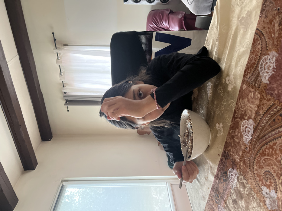 This image depicts an indoor scene, described as being in Lampertheim, France. A young individual with dark hair is seated at a table, facing forward, with her right hand partially obscuring her face and her fingers touching her forehead. She wears a black long-sleeved top and a pink beaded bracelet on her right wrist. Her left hand holds a metal spoon inside a white ceramic bowl, which contains a greyish, granular substance, positioned directly in front of her. The table is covered by a patterned tablecloth, featuring a dark reddish-brown paisley design in the foreground and a lighter cream-colored section with a subtle pattern closer to the individual. Behind the seated individual, a black chair with a mesh back is visible. To the right, a white tote bag with a prominent blue "V" logo is present, alongside a portion of reddish-pink upholstered furniture and a white object with multiple circular elements. To the left of the individual, a large window with a white frame allows diffuse natural light into the room, revealing an indistinct outdoor view. A second window is visible on the right wall, covered by white sheer curtains suspended from a black rod. The room's walls are light-colored, and the ceiling features two prominent, exposed dark wooden beams.
