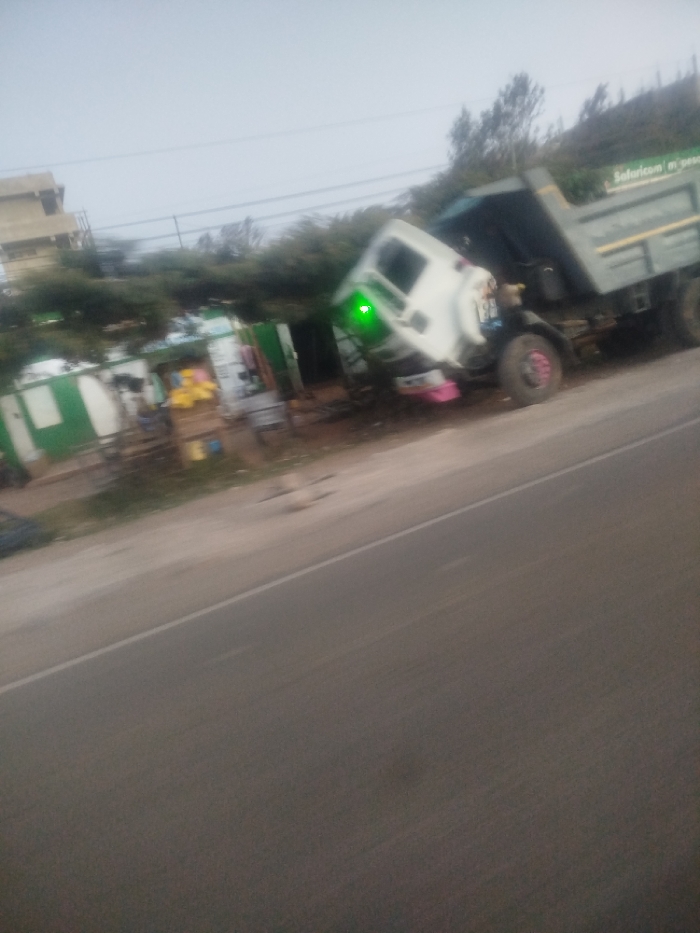 A gray and white dump truck is parked on the side of a road. Its cab is angled upwards and toward a small, green roadside shop. The truck’s bed is raised. The road is a smooth, dark asphalt. Buildings can be seen in the distance, and there is green foliage in the background. The image is slightly blurry.