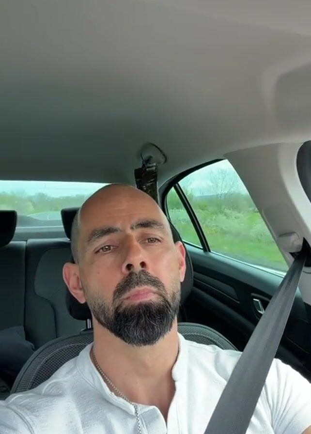 A man is driving a car. He is bald with a salt and pepper beard, and he is wearing a white shirt and a silver necklace. He is looking directly at the camera. The background shows a road with green trees and fields. Music is playing in the car. The man is wearing his seatbelt. There is a coat on the back seat. The camera is focused on the man in the driver's seat, and is likely recording from the dashboard or from the person's hand.