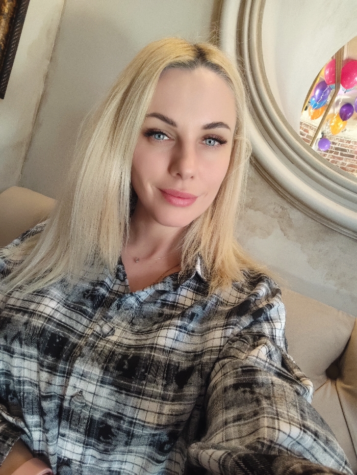 A blonde female is depicted from the chest up, positioned centrally in a selfie-style photograph. She has long, straight blonde hair, blue eyes, and is looking directly at the camera with a faint smile. She is wearing a long-sleeved plaid shirt with a pattern of black, white, and grey, and a delicate silver chain necklace with a small pendant is visible around her neck. She is seated on a light beige or tan upholstered sofa, which is visible on the lower right portion of the frame. The background features a light-colored wall. To the right, a large circular mirror with an ornate, light-colored frame reflects an interior space containing a section of a brick wall and multiple brightly colored balloons in hues of pink, purple, orange, blue, and yellow. A dark framed object is partially visible on the far left edge. The scene is set indoors, in the city of Yevpatoriya, Ukraine.
