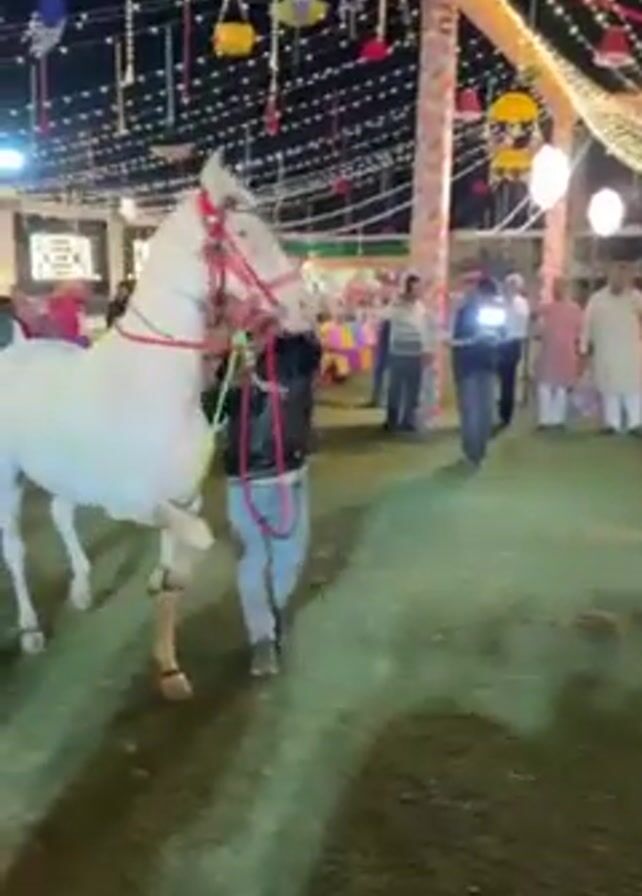 The scene is an outdoor event at night, likely a wedding or celebration, illuminated by strung lights and colorful decorations. A white horse, with a reddish bridle and light green halter, is the central focus. A man in jeans and a dark jacket is holding the horse's reins. In the background, various people are standing and milling about. One person is wearing a vibrant blue and yellow outfit. The ground appears to be covered in artificial turf. The scene has a festive atmosphere, underscored by music playing in the background.