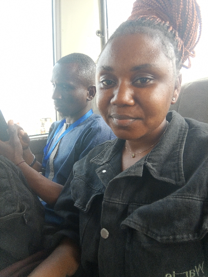 The image depicts two individuals seated within what appears to be the interior of a vehicle. The scene is reported to be in the city of Rafin Par, Nigeria. In the foreground, positioned to the right, is a female individual with dark skin and dark brown braided hair styled in an updo. She wears a dark-colored, possibly black or dark grey, denim-style jacket with visible silver-toned buttons and stitching. A thin, gold-colored necklace with a small, dark pendant is worn, and a single stud earring is visible in her right ear. Her left hand, partially visible, holds a dark rectangular object consistent with a smartphone, and a small, dark red bracelet is on her wrist. She is looking directly at the camera with a slight smile. Behind and to the left of the female is a male individual with dark skin and short, dark hair. He is wearing a light blue long-sleeved garment over a lighter undershirt, with a blue lanyard visible around his neck. His gaze is directed towards the left side of the frame, away from the camera. A light-colored band is visible on his right wrist. The environment indicates an interior space, likely a vehicle, with light brown or tan upholstered seats. A bright, overexposed area outside a window suggests strong daylight. A metal fixture is visible near the window frame. Both individuals appear to be seated, with the female possibly capturing the image or being photographed.