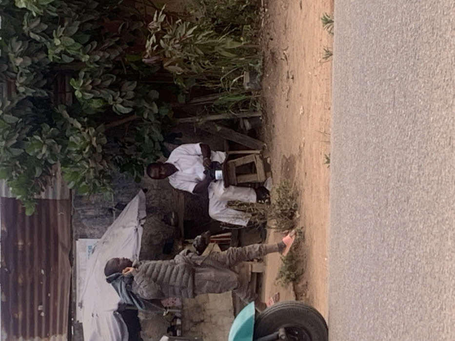 Two men are situated outdoors. One is sitting on a small wooden stool, wearing a white shirt and pants. He is holding an object in his hands. The other man is standing, wearing a gray quilted jacket and pants. A light blue object and a wheel are at the bottom. A corrugated metal structure and white tarpaulin are in the background, beside a leafy tree. A dirt path leads to a paved area on the right.