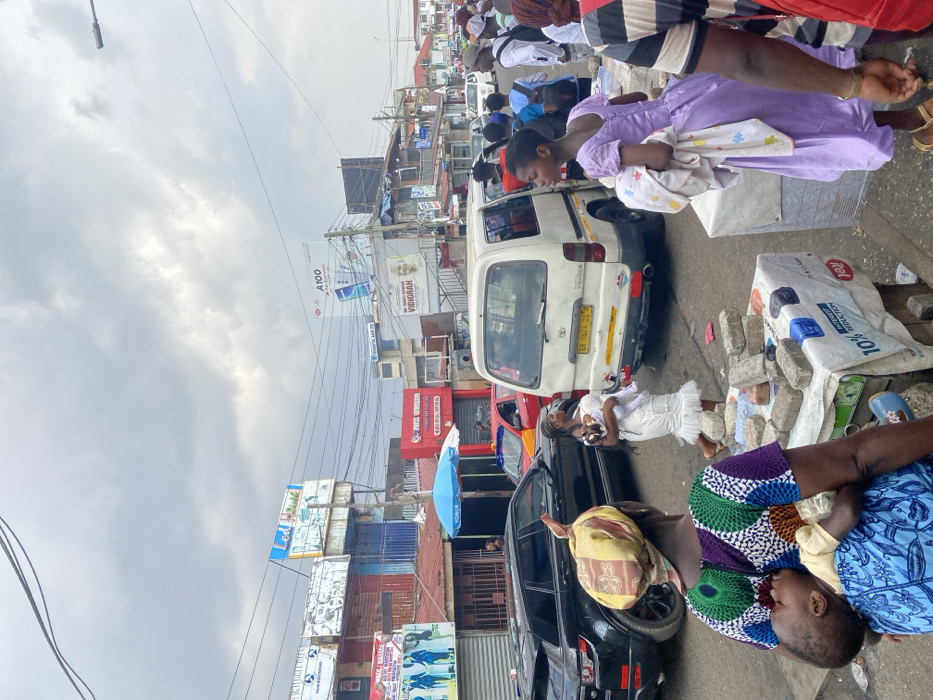 The image depicts a bustling urban street scene in Accra, Ghana, under an overcast sky