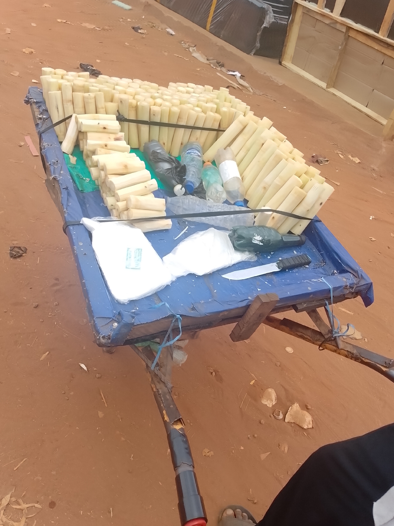 hand-pulled cart laden with what appears to be cut sugarcane stalks. The cart is blue and partially covered with plastic bags. Water bottles and a knife are visible among the sugarcane. The cart is on a dirt road in Ejule, Nigeria. A person is pulling the cart, and only their leg and foot are visible in the lower right corner of the image. There are buildings visible in the background.