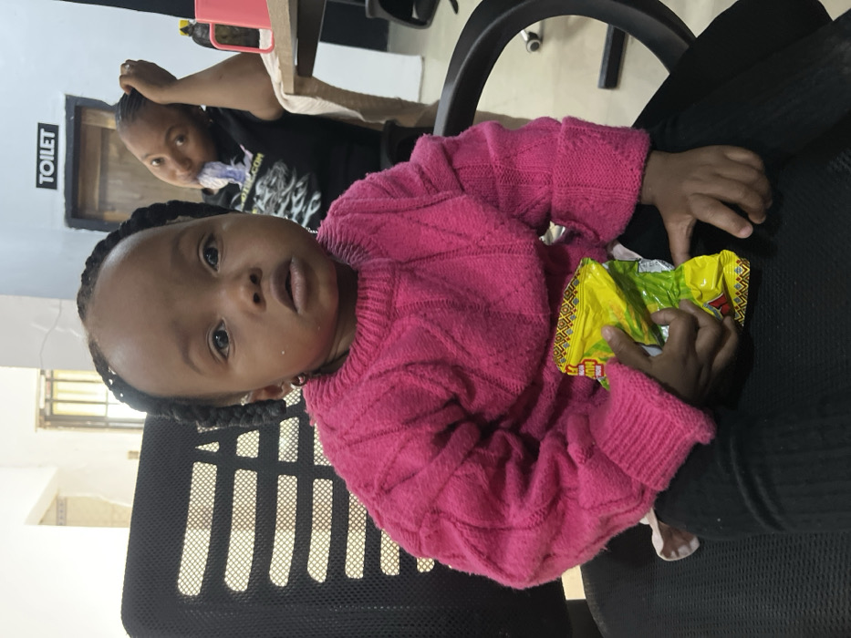 A young child in a bright pink sweater sits on a person's lap, holding a partially open bag of chips. The child has dark hair in braids and is looking upwards with a slightly open mouth. In the background, a woman is visible adjusting her hair near a desk. A sign with "TOILET" is seen behind her. The setting appears to be indoors, possibly an office or a waiting area.