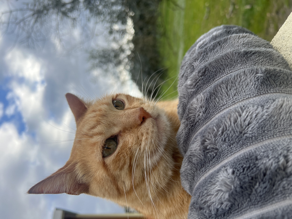 An orange tabby cat looks up at the camera with a curious expression. Its bright green eyes and pink nose are prominent. Part of its face and head are nestled against a gray, ribbed, soft-looking object. The background shows a blurry mix of green foliage and a cloudy sky, suggesting the photo was taken outdoors. The angle is slightly tilted, giving a unique perspective.
