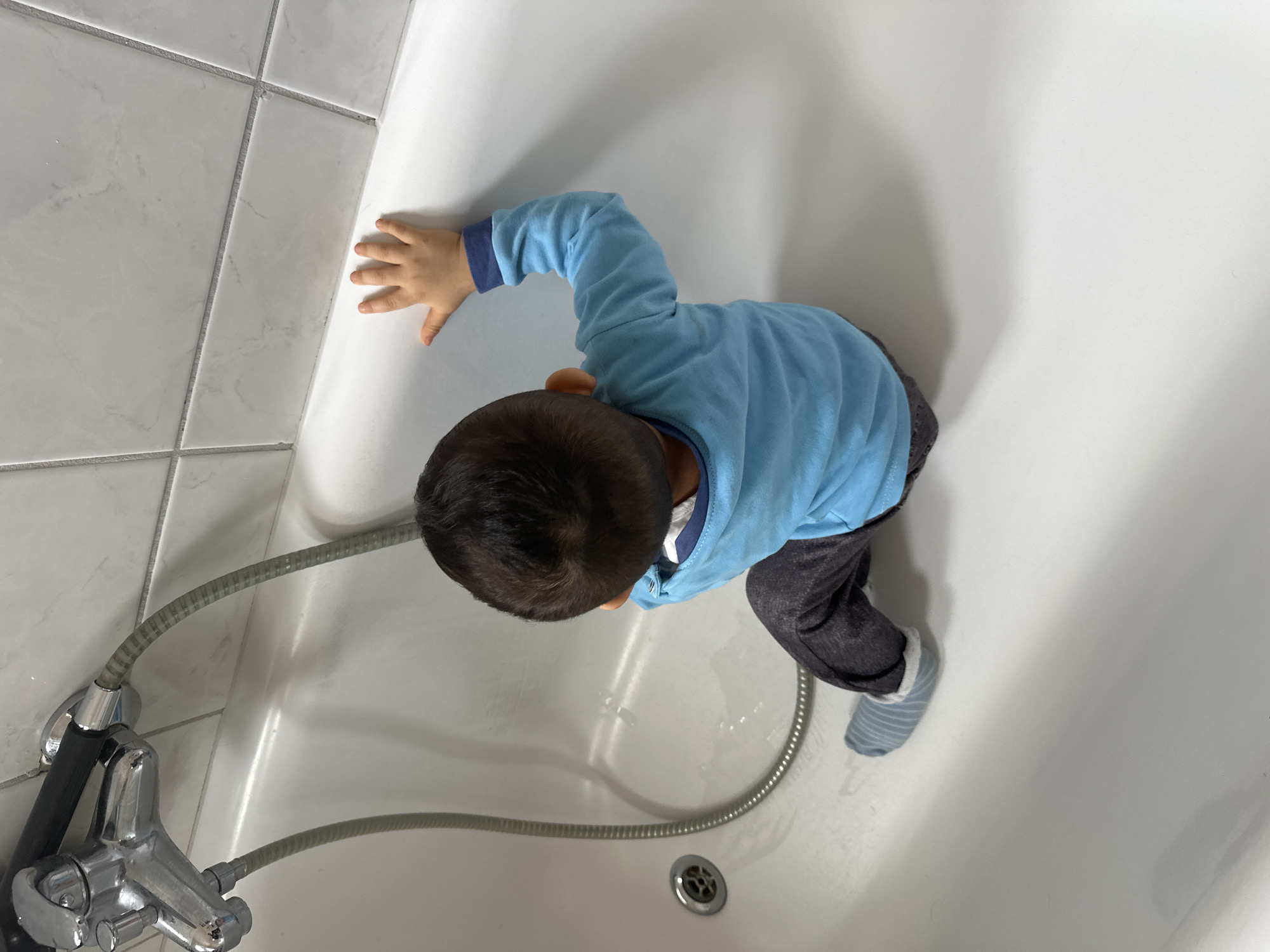 A young child wearing a blue long-sleeved shirt and grey pants is in a white bathtub