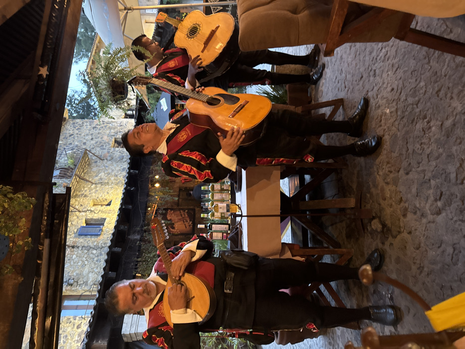 Three adult male musicians perform in an outdoor restaurant setting in Domingo Arenas, Mexico