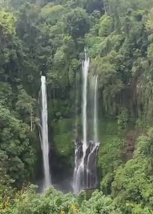 three-tiered waterfall cascading through a lush green forest. The water appears white and foamy as it plunges down the rocky cliffs. The surrounding vegetation is dense and vibrant, with tall trees and various shrubs covering the landscape. In the foreground, there are a few orange flowers. The sky is overcast. The camera pans slightly to the right, revealing more of the forest and additional waterfall structures.