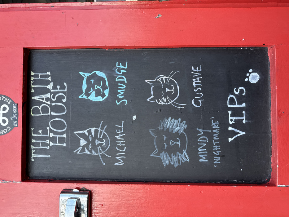 A vertical, rectangular black chalkboard sign is recessed into a vibrant red wooden frame, likely part of an exterior door or wall. To the left of the chalkboard, a silver-colored metal latch mechanism is visible on the red frame. A partially visible round sticker, white with a black logo and text "LIVE LOVE CREATE" and "COMMUNITY BATHS," is affixed to the top-left section of the red frame. The chalkboard features various inscriptions and drawings in white and blue chalk. At the top, "THE BATH HOUSE" is written in white capital letters. Below this are four stylized cat head illustrations arranged in two rows. The top-left cat, drawn in white, is labeled "MICHAEL." The top-right cat, filled with blue chalk and outlined in white, is labeled "SMUDGE." The bottom-left cat, drawn in white with a textured mane, is labeled "MINDY 'NIGHTMARE'." The bottom-right cat, drawn in white with striped markings, is labeled "GUSTAVE." At the bottom of the sign, "VIPs" is written in large white chalk letters, accompanied by a white chalk paw print in the bottom-right corner. The scene is located at the Camberwell Leisure Centre (formerly Camberwell Public Baths) in Camberwell, Southwark, Greater London, United Kingdom.
