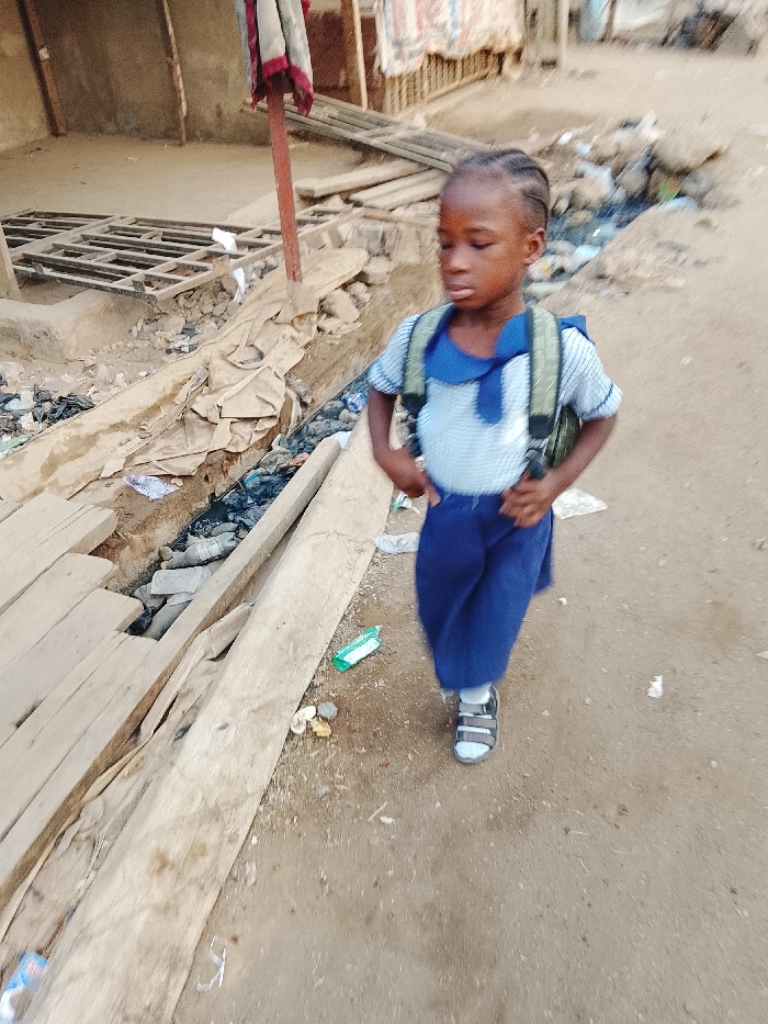 A young girl in a school uniform with a backpack stands on a dirt path in what appears to be a disadvantaged area. Debris and makeshift structures are visible in the background, alongside open drainage filled with trash. The girl looks down, with her hands on her hips. A pole with a torn covering stands nearby. The overall setting suggests poverty and challenging living conditions.