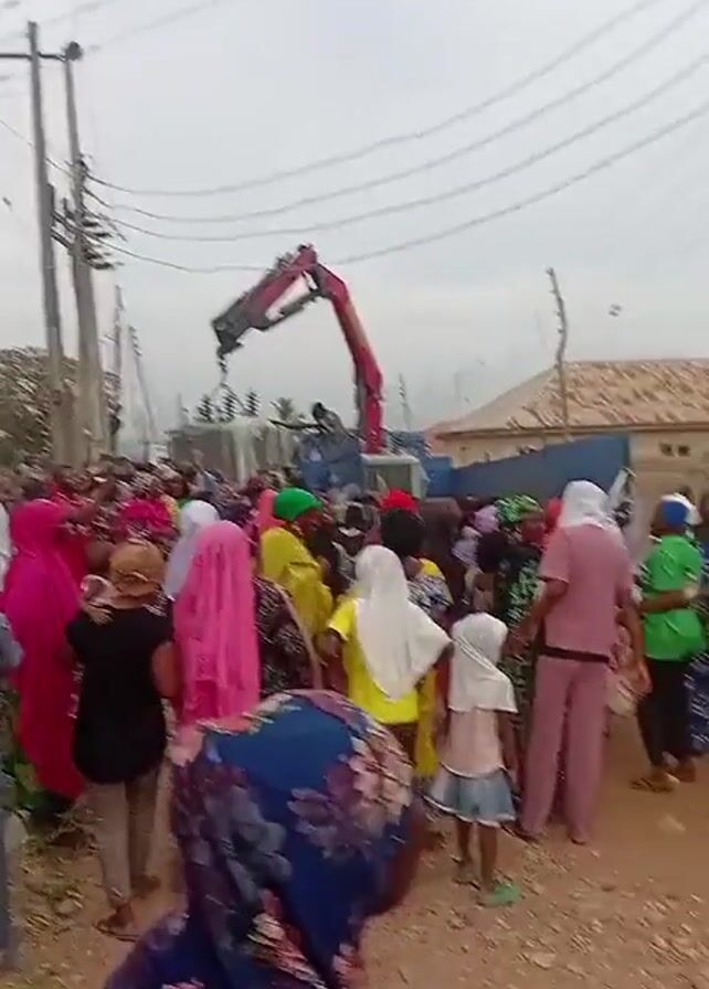 A crowd of people, predominantly women wearing colorful traditional clothing and head coverings, stand on a dirt road, looking at a crane lifting a large, covered object onto the back of a truck. Overhead power lines are visible. A building is in the background. The sky is overcast.