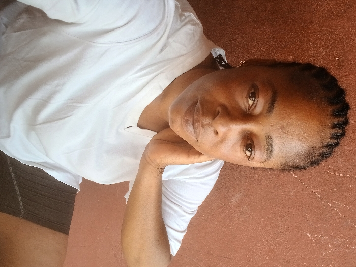 The image displays a close-up portrait of an adult female in Markurdi, Nigeria. The subject has dark skin, with her hair styled in small, dark braids pulled back from her face. She is wearing a plain white short-sleeved t-shirt with a V-neck and dark, ribbed shorts. Her gaze is directed towards the camera, and her expression is neutral. Her right hand is positioned with fingers slightly curled, resting against the right side of her neck and jawline. The background is a solid, reddish-brown wall with subtle texture variations. Lighting appears to be ambient and even.