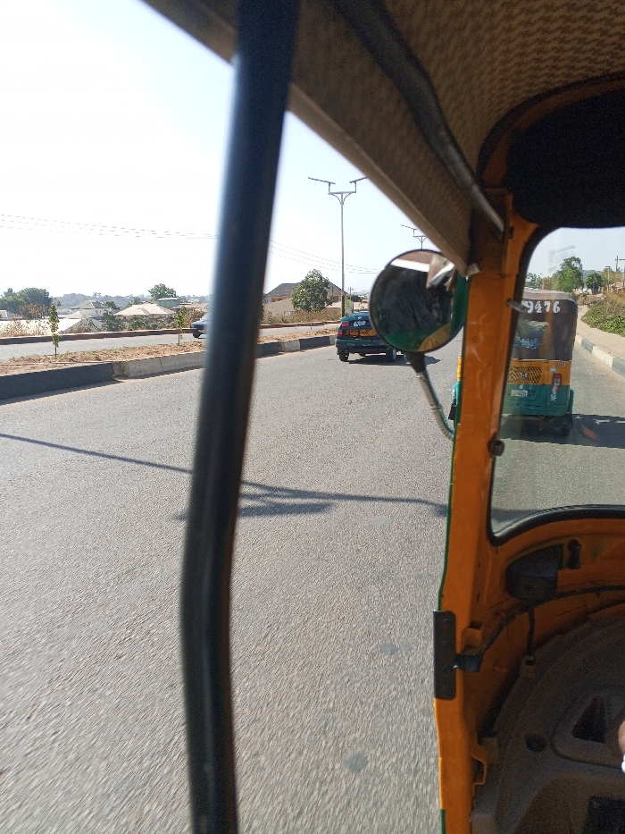 The image presents a daytime road scene in Jos, Nigeria, captured from the interior perspective of a moving orange and green auto-rickshaw