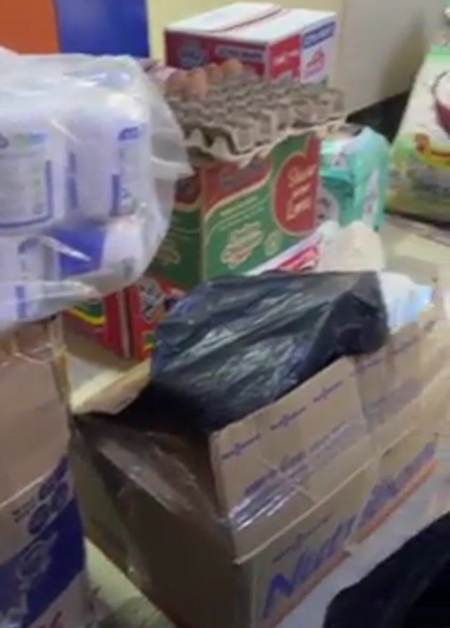 room full of groceries and supplies. There are rolls of toilet paper, eggs, boxes of Indomie noodles, bags of rice, and boxes of various other products. A person wearing a white t-shirt and grey pants enters the frame and picks up a large box. They walk past the rice sacks and towards a glass display case. The room appears to be a storage area or the back of a small grocery store. The floor is tiled, and the walls are a mix of painted and bare concrete.