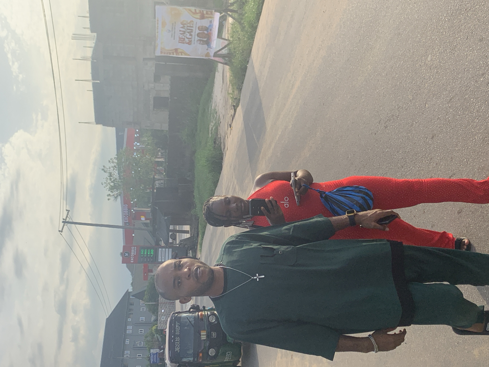 Two individuals stand on a paved road. One person, wearing a dark green long-sleeved shirt, a silver necklace with a cross pendant, and black sandals, is positioned closer to the foreground and appears to be looking at the camera. Behind them, a second person is wearing a red outfit, holding a mobile phone, and a blue and black striped shoulder bag. A tricycle with the inscription "JESUS WEPT" is in the background. In the background, a gas station with the name "EXCOBBIG" is visible. A partially constructed building and a billboard are also in the background. The location appears to be Aba, Nigeria.