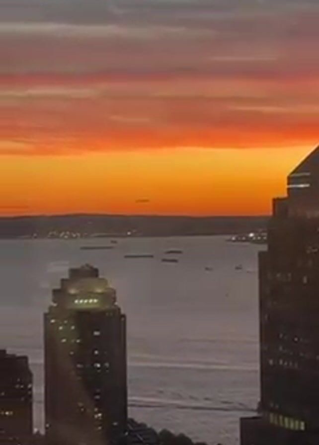A view of a sunset over a city skyline and water is captured from indoors through a window. Buildings with illuminated windows stand in silhouette against the vibrant orange and pink sky. The water reflects some of the sunset colors. There are hints of city lights along the horizon. The video is slightly obstructed by reflections on the window. The camera angle is low.