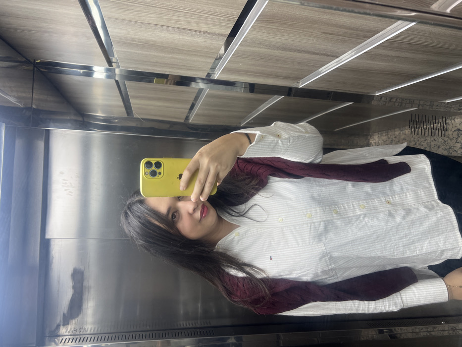 A woman is depicted inside an elevator, taking a mirror selfie using a yellow-cased iPhone with three distinct camera lenses. She has long, dark hair and is wearing a white, collared, long-sleeved shirt with faint vertical stripes and a small red and blue logo on the left chest. A burgundy cable-knit sweater is draped over her shoulders. Her right hand holds the phone, partially obscuring the lower right side of her face. She has red lipstick applied. The elevator interior features a brushed metallic back wall and a paneled right wall composed of light brown wood-grain laminate sections separated by horizontal and vertical chrome strips. The floor is light-colored speckled granite. The scene is set in an elevator in Meknes, Morocco.